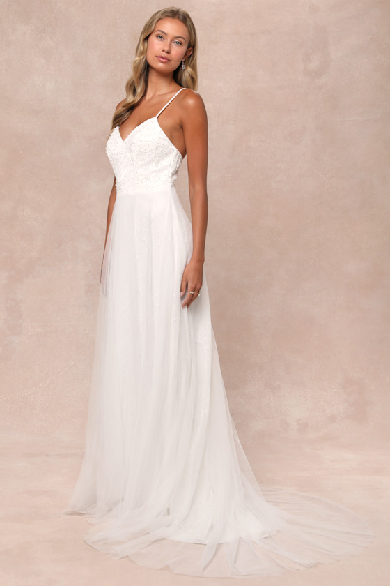 Love Perfection White Lace Tulle Pearl Beaded Maxi Dress Dress